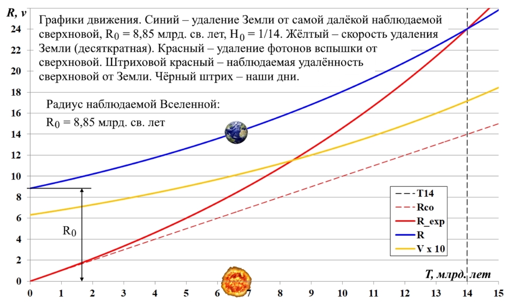 Как видим, на момент получения света на Земле галактика будет находиться от неё на удалении в 24 млрд. световых лет. Начальную удалённость галактики от Земли, при которой в процессе расширения пространства она удалится на это же расстояние, определим обратным вычислением по уравнению движения, показанного синим графиком R. Находим, что это 8,85 млрд. световых лет. Галактика, находившаяся в начале расширения пространства именно на этом удалении от Земли, удалится от неё на 24 млрд. световых лет, на такое же расстояние, на какое фотоны вспышки удалились от неё.