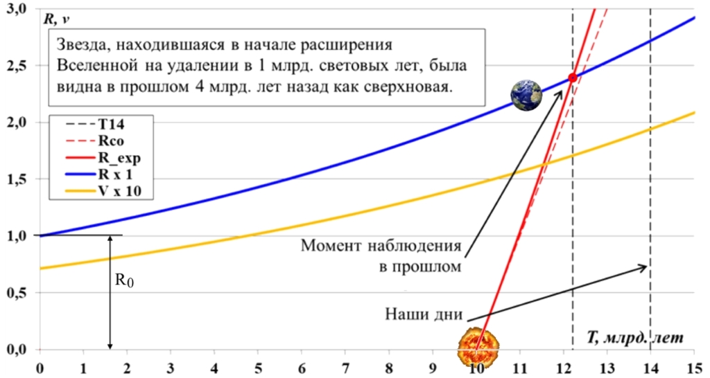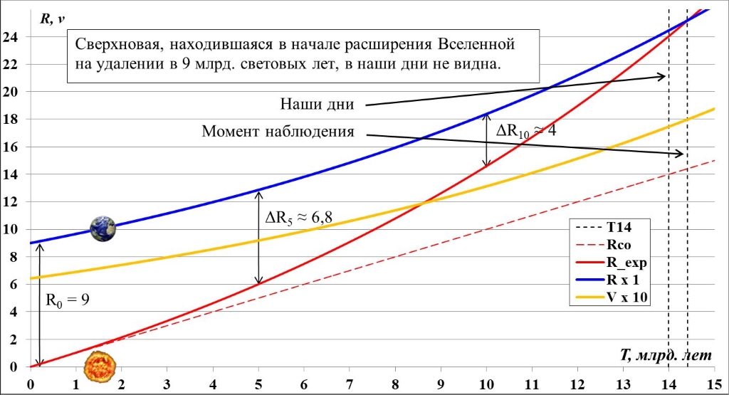 Отметим, что расстояние R_exp между фотонами вспышки и наблюдателем на Земле R постоянно уменьшается. Если в начальный момент расстояние между звездой, фотонами её вспышки и Землёй было 9 млрд. световых лет, то через 5 млрд. лет оно уменьшилось до ~ 6,8 млрд. световых лет, а через 10 млрд. лет – до ~ 4 млрд. световых лет.