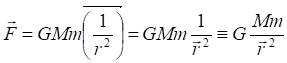 Следует признать, что вектор близости или, тождественно, обратной величины удалённости в уравнении (6) сам по себе имеет весьма туманный, неопределённый смысл. Однако, в уравнении имеется "свободный", скалярный сомножитель, левый. Конечно, куда его поместить, как говорится, дело вкуса. Однако, замечаем некоторое сходство уравнения (6) и уравнения (3). Если в уравнении (3) мы вынесем за векторные скобки одну из тождественных величин – близостей, что определённо является разумным, и сократим на массу m, то получим тот же результат, что и при внесении в векторные скобки уравнения (6) этой скалярной величины GM