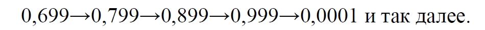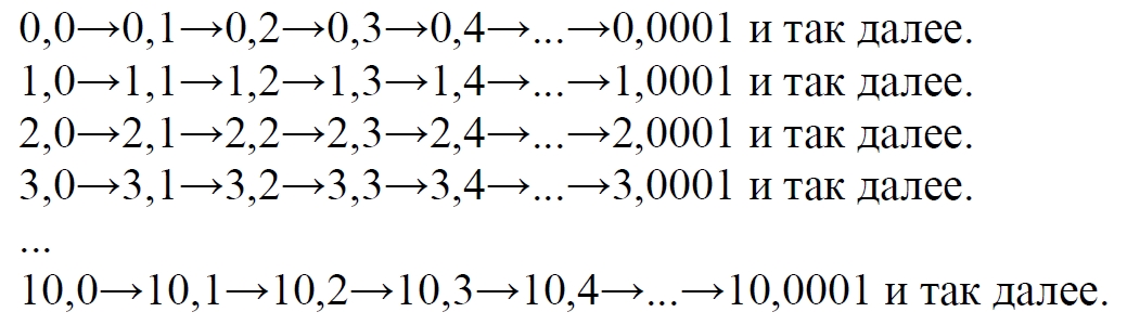 Например, под номером 12345678 будет записано действительное число 0,87654321, а инверсией последовательных натуральных чисел 996, 997, 998, 999, 1000 будет создан фрагмент последовательности действительных чисел: