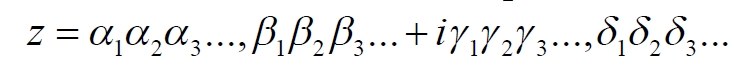 Количество цифр α, β, γ и δ в записях может быть любым. Теперь, используя метод комбинации, можно получить число N, инверсная запись которого и будет обозначать натуральный порядковый номер этого числа в их бесконечном массиве. Например, приведенное выше комплексное число будет иметь в бесконечном массиве всех возможных комплексных чисел натуральный порядковый номер 200 123 021 325. Кстати, можно заметить, что в таком массиве первые 10 чисел (0…9) являются реальными, а число i (комплексная единица) находится на позиции 100 и имеет порядковый номер 10. Также заметим, что при таком подходе основой всех чисел являются вещественные числа, а различные комплексные и им подобные – это простая комбинация этих базовых чисел. Условно говоря – все эти комбинационные числа являются своеобразной тенью, миражом чисел реальных.