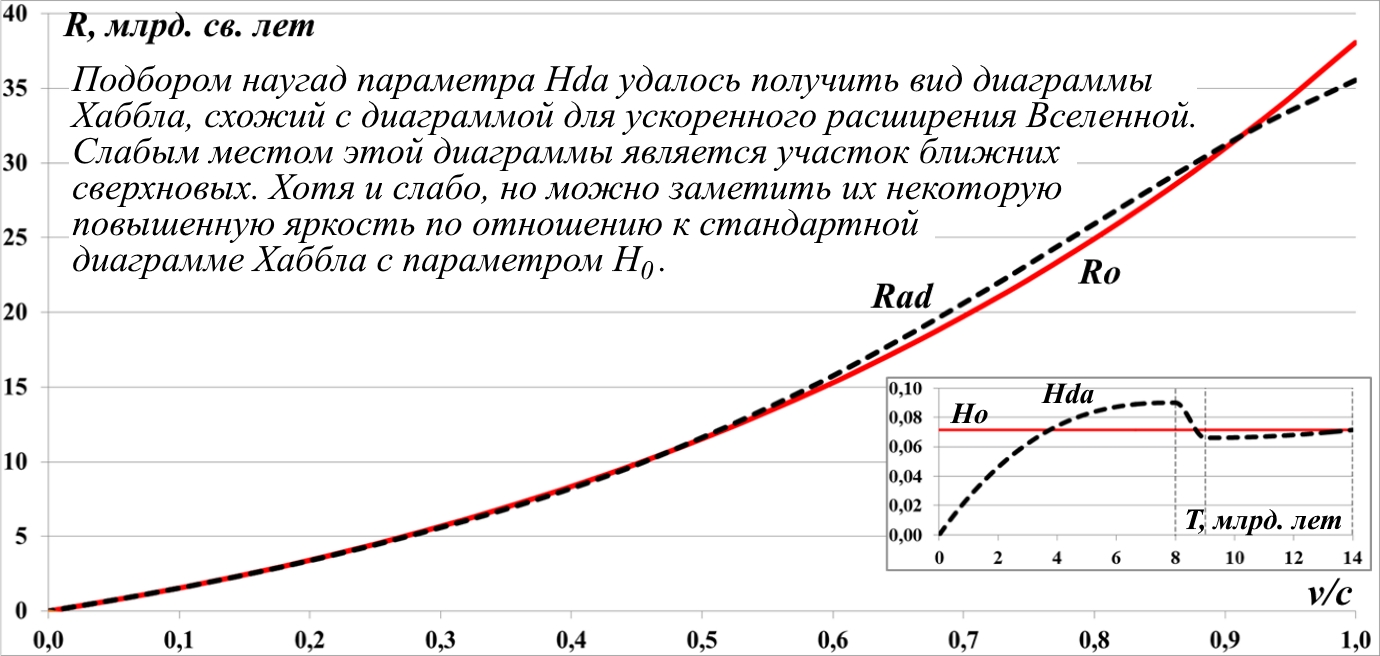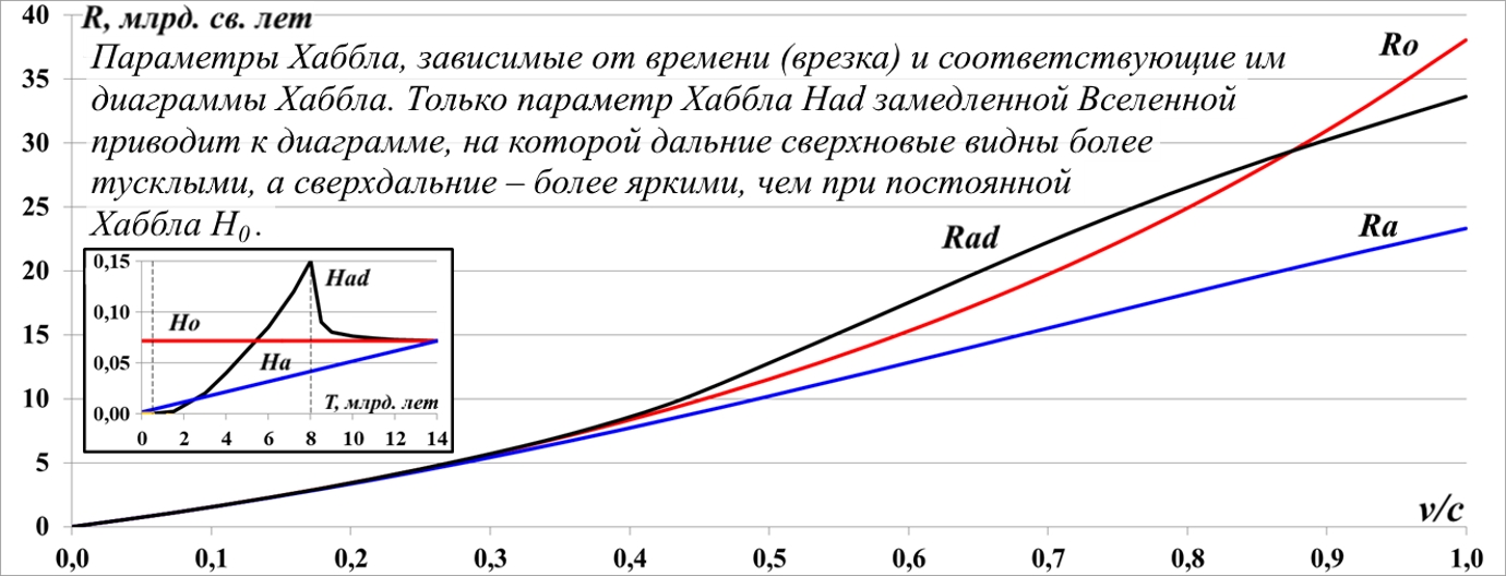На рисунке показано, что рассмотренная диаграмма Хаббла "замедленно – ускоренной" Вселенной также будет получена по наблюдениям во Вселенной с параметрами Хаббла, имеющими вид, подобный показанным на врезке рисунка. На всём протяжении существования такой Вселенной значения параметров были не только близки к нулю, но были даже отрицательными. То есть, большее время, почти 11 млрд. лет Вселенная не расширялась, а сжималась. И только в последние 1,5 млрд. лет началось её стремительное расширение.