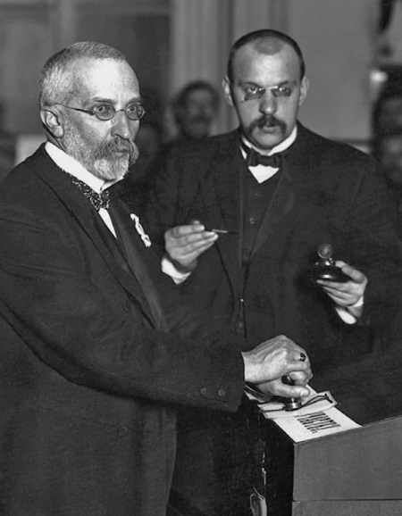 Выборы во Вторую Государственную думу. Председатель избирательной комиссии В. Тимирязев (слева) запечатывает урну по окончании голосования. Фрагмент. 1907 г.