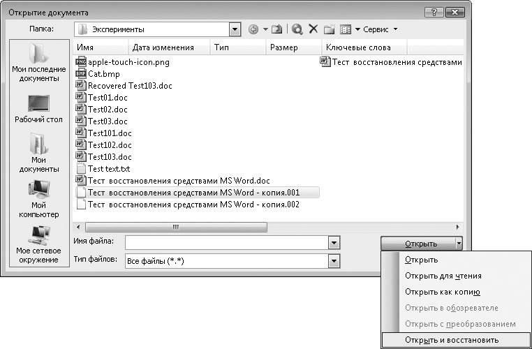 3. Нажмите на стрелку рядом с кнопкой Открыть и выберите команду Открыть и восстановить (рис. 1.3).