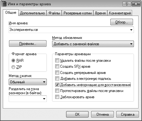 Формат RAR предусматривает внесение в архив избыточной информации – так называемой информации для восстановления сразу при его создании. Для этого при добавлении файлов в архив в окне Имя и параметры архива необходимо установить флажок Добавить информацию для восстановления (рис. 1.5). По умолчанию этот флажок снят. На вкладке Дополнительно задается относительный размер информации для восстановления в процентах от общего размера архива.