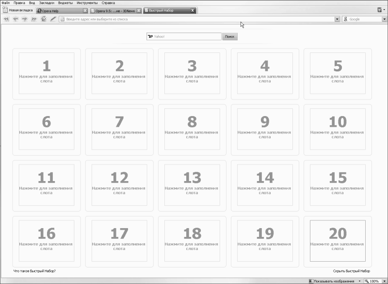 Если по данному адресу файла speeddial.ini_ не существует, то вам нужно создать его. Для этого создайте документ с расширением TXT, а затем просто переименуйте его в speeddial.ini_ и введите в нем же вышеназванную запись. В итоге вместо девяти ячеек появится двадцать (рис. 2.51).