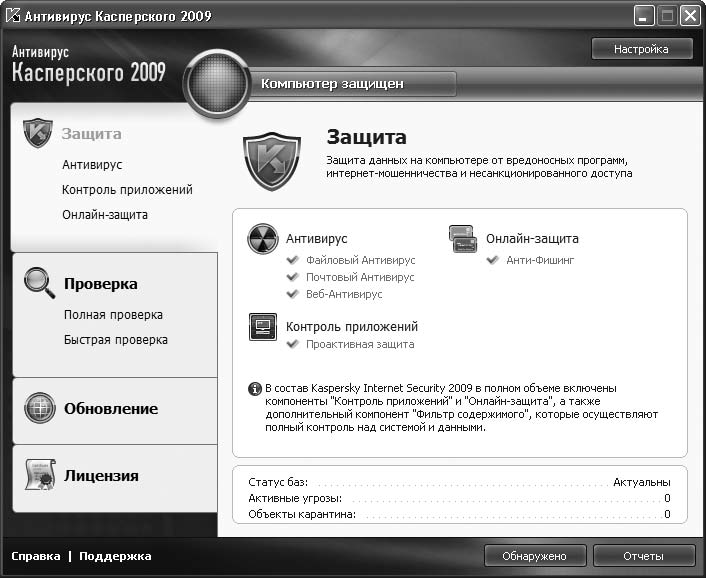 Данная программа – также российская разработка. Производитель – «Лаборатория Касперского» (http://www.kaspersky.ru). Антивирус обладает широким спектром возможностей. Помимо обнаружения и лечения вирусов, он справляется с «троянскими конями», программами-шпионами и другими вредоносными программами. Программа обладает возможностью проактивной защиты, которая позволяет обнаруживать даже неизвестные вирусы. «Антивирус Касперского» (рис. 3.3) в свое время зарекомендовал себя с отрицательной стороны из-за значительного снижения быстродействия компьютера. В последующих версиях этот недочет был устранен, и в настоящее время быстродействие остается на приемлемом уровне, хотя у многих пользователей этот антивирусный пакет по сей день ассоциируется с медленной работой системы.