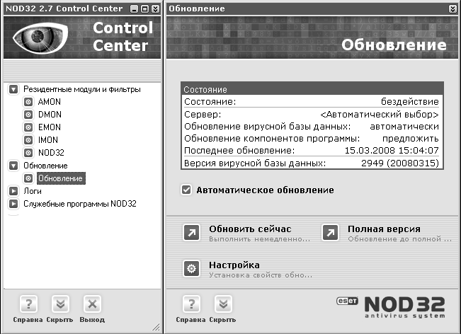 Этот антивирус выпускается словацкой компанией Eset (http://www.eset.com) (рис. 3.4). По словам разработчиков, программа обеспечивает защиту от всех известных вирусов, «червей», шпионов и «троянских коней».