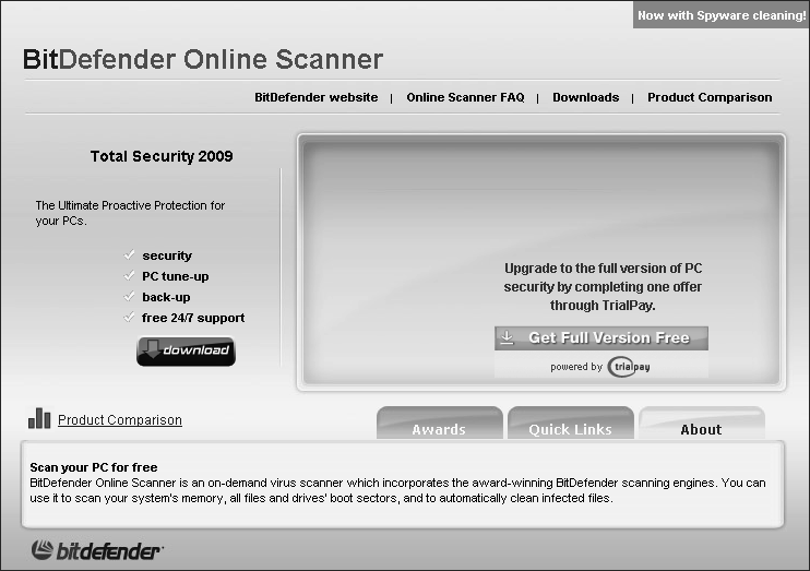 BitDefender Online ScannerBitDefender Online Scanner (http://www.bitdefender.com) позволяет с высокой эффективностью находить вирусы. Программа хороша для лечения зараженных файлов, ведения подробного описания проделанной операции и сканирования загрузочных секторов диска. Кроме того, на сайте программы предоставляется подробная справочная информация о вредоносных программах. Из недостатков можно отметить отсутствие предупреждения о возможной потере информации при удалении вируса и невозможность распознавания вирусов в открытых файлах (рис. 3.5).