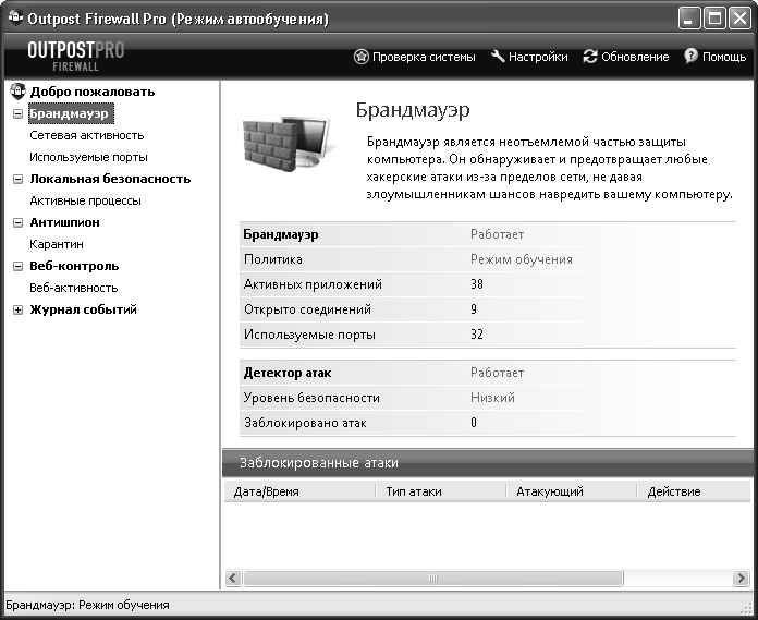 Брандмауэр Outpost Firewall Pro (http://www.agnitum.ru) обладает стандартными для программ такого рода возможностями, среди которых фильтрация входящих и исходящих сетевых соединений, наглядное отображение сетевой активности, наличие режима обучения. Нужно отметить простоту настройки и использования брандмауэра Outpost Firewall Pro (рис. 3.8).