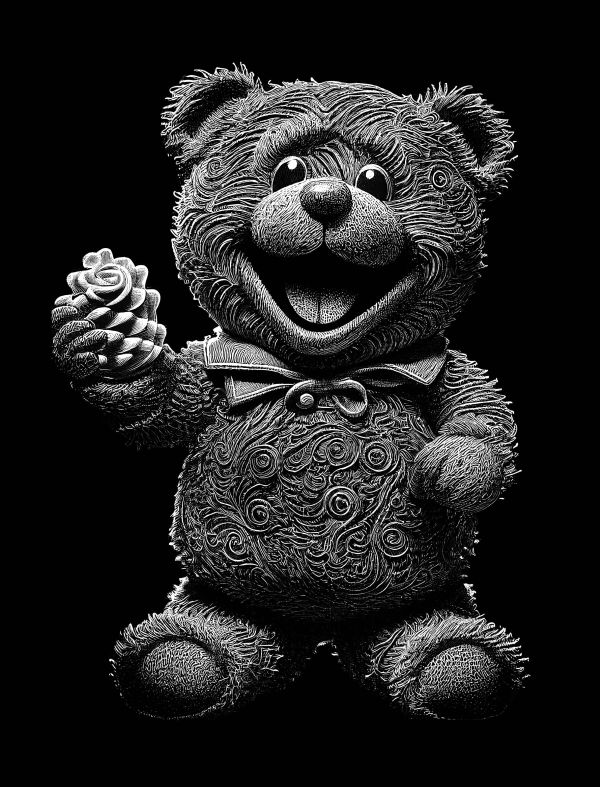 Входит в кухню. Там в темноте две чёрные тени сидят, бормочут что-то. Испугалась Машутка, замерла. Потом прислушалась – а это её бабушка с дедушкой. А у их ног – сахарный Мишутка мерцает и туда-сюда важно похаживает. От бабушки к дедушке. От дедушки к бабушке. А те ему всё подкидывают да подкидывают что-то. Подошла Маша поближе и видит, что в тени стоит тазик, а в тазике – Петя, хлопает глазками да что-то беззвучно кричит.