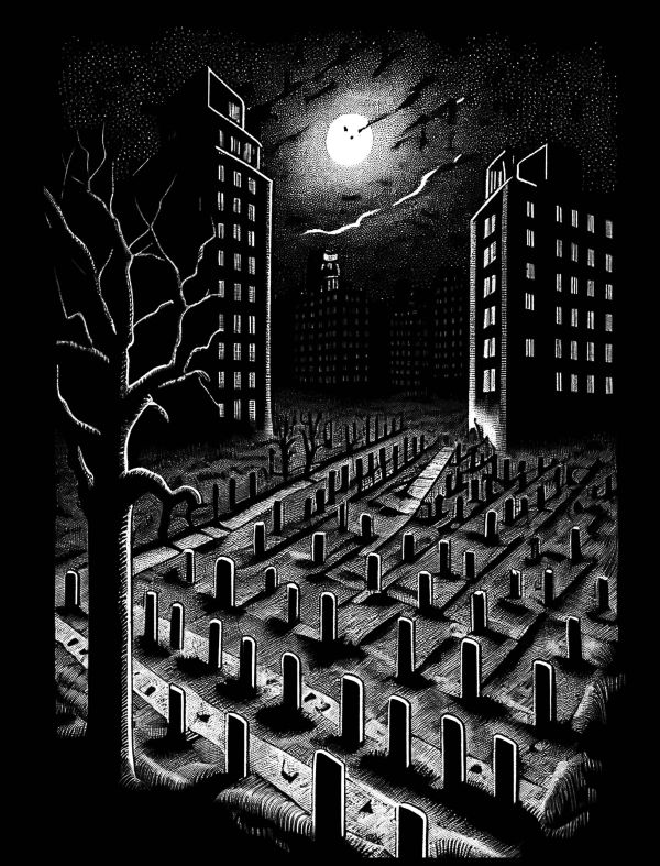 Петя и мама переехали в новую квартиру. Мама взяла себе комнату с балконом, чтобы курить, а Пете дала большую комнату. Окна у Пети выходят на кладбище.