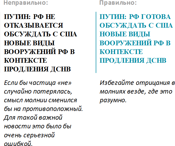 Совет: избегайте в молнии частицы «не» с глаголами! Потеря частицы «не» перевернет смысл новости, а выявить такую ошибку на этапе выпуска сообщения практически невозможно. Там, где это возможно, ищите глаголы, которые позволят передать смысл сказанного без «не».