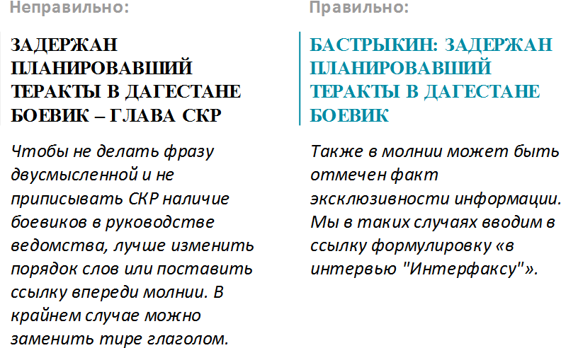 Примечание: «Интерфакс», как и другие крупные агентства, имеет ленты, ориентированные на разные группы пользователей, и это необходимо учитывать. Например, на общеполитической ленте не следует давать молнии, использующие профессиональный сленг или аббревиатуры.