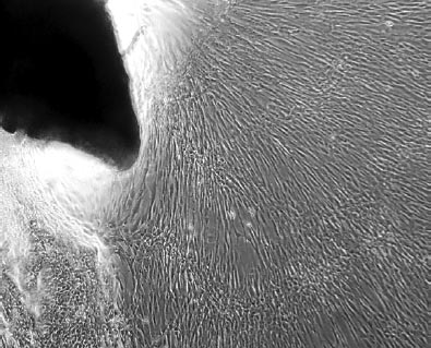 My skin cells (fibroblasts) growing in a petri dish (in vitro) from a piece of skin tissue taken from my arm.