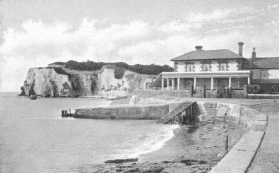 I swim off Freshwater Bay, overlooked by the same Albion Hotel from where Adams began his tour. ‘Though the beach is pebbly and rocky, bathing is good, the sea being in calm weather remarkably clear,’ my 1950 guide informs me. ‘Boating under ordinary conditions is quite safe, but for trips of any length, a man who knows the coast should certainly be taken.’ The water is salty and buoyant. I’d been looking forward to it and dreading it at the same time. There’s no comforting land on the horizon, only the steely sea. Around me old plastic containers bob, tethered to lobster pots below. The cliffs rise as a backdrop, their soft chalk embedded with flints like nuts in a bar of nougat. Grey and white pebbles as big as tennis balls roll under my feet. The water is cold and my swim is brief, although it has the usual effect of washing my sins away.