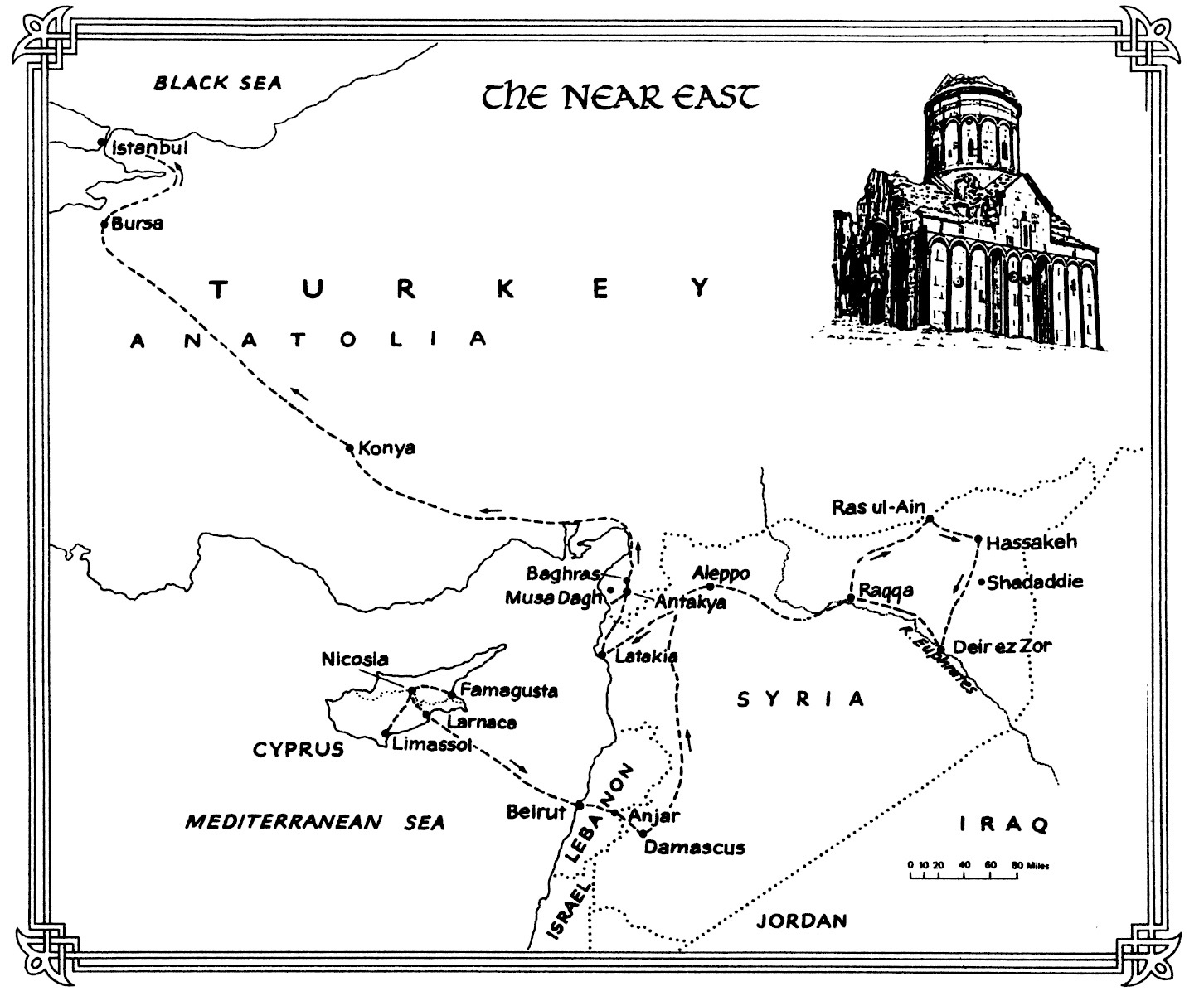 He opened one of the drawers and handed me the xerox copy of a hand-drawn map. Years of interviews had gone into that map, he said. He had collaborated with an Armenian truck driver who knew every town and village of northern Syria, and they had spliced the oral information with the few written records to draw the map. It looked to me somewhat like a tidal chart: a mass of arrows curling and twisting down the page. But the arrows, when I looked closely, were overlaid on a map of the Near East and they all pointed in more or less the same direction, away from Anatolia, south towards the Syrian desert.