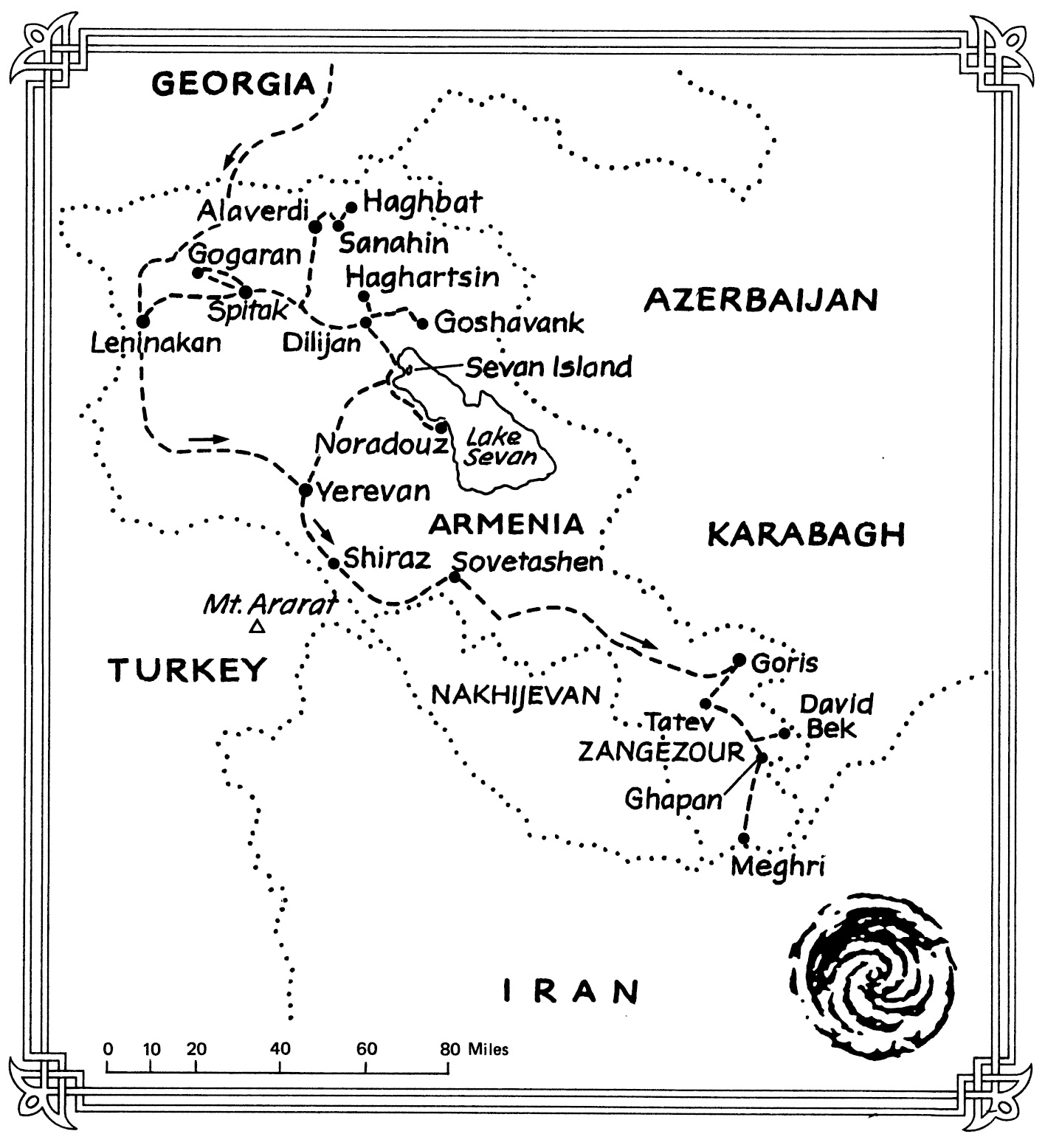 For months before, I’d been living in a single-room flat in the Armenian quarter of Jerusalem’s Old City. I took daily lessons in Armenian with the charming Father Anooshavan, who was alleged to speak thirty-six languages. I spent a great deal of time with the poet and historian George Hintlian, who acted as mentor to my planned odyssey. I talked to monks, scholars and seminarians. I met recent refugees from Karabagh, second-generation refugees from Iran, and third-generation refugees from Turkey. In 1915 the entire Armenian population had been driven from Anatolia; many were massacred there, on the edge of dusty towns; many more were driven down into the Syrian desert. Over a million died. In Jerusalem, there were a few very old survivors who, in darkened rooms, laid their stories before me.
