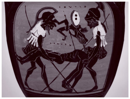 Танатос (Смерть) и Гипнос (Сон) уносят тело греческого героя Сарпедона, а дух павшего воина витает между ними