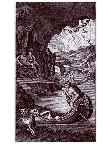 Потусторонняя идиллия: по Стиксу в лодке плывет Харон, на заднем плане восседают Аид и Персефона, в углу сидит Цербер