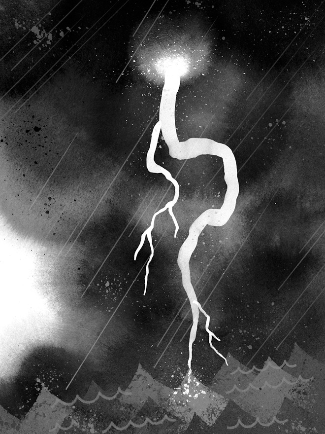 На вершине горы Роз было спокойно и уютно. Поэтому она провела там несколько дней и ночей. Но однажды всё изменилось: на гору наползло тяжёлое низкое облако, и Роз окутал сплошной белый туман. Когда он рассеялся, оказалось, что над островом, с севера на юг, плывёт ещё много-много облаков. Затем Роз услышала глухое ворчание. Она повернулась на звук и увидела, что небо с той стороны затянуто чёрной пеленой. То тут, то там черноту разрезал свет. И оттуда вновь донеслось глухое ворчание.