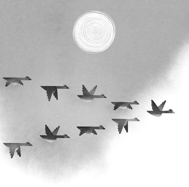 Гуси летели. Внизу мелькали города, поля, реки. Далеко впереди, где земля сливалась с небом, заблестела синяя полоска воды. Океан был всё ближе и ближе. Наконец стая пронеслась над песчаным берегом, а за ним открылся бескрайний простор.