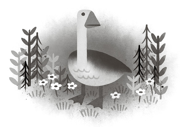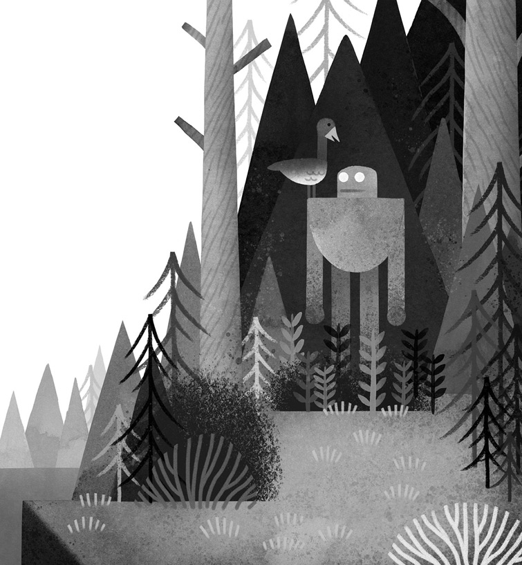 Гусь громко затрубил и стал ждать ответа. Тишина. Но вдруг лес пришёл в движение. Задрожала кочка, на которой рос папоротник. Земля вздыбилась. Во все стороны полетели комья. И вот перед вожаком гусиной стаи возник робот.