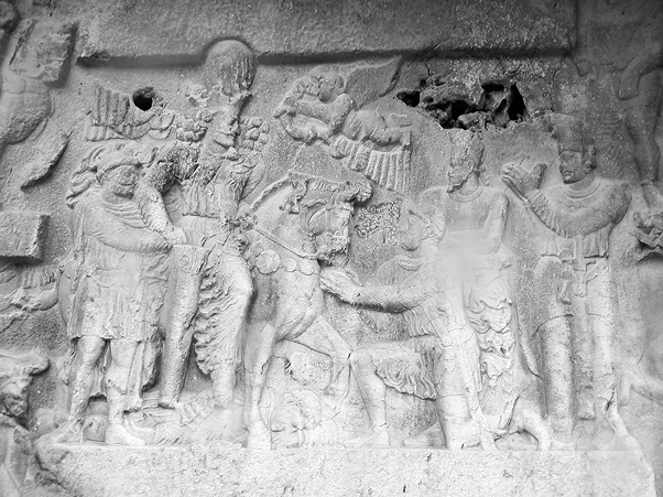 Илл. 4. В тени Персии. Римский император Валентиан показан как вассал, преклоняющий колена перед Шапуром I, который изображен преемником Дария и Ксеркса, что обосновывает его право на восточные провинции Римской империи. Рельеф в Бишапуре, вторая половина III века н. э.