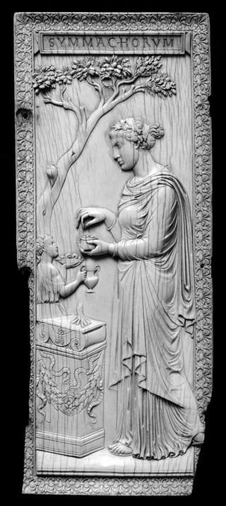 Илл. 6. Ренессанс классики. Этот диптих из слоновой кости изготовлен в честь свадьбы дочери Симмаха (см. с. 126), римского сенатора-язычника конца IV века. Музей Виктории и Альберта, Лондон. © Victoria and Albert Museum, London.