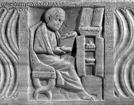 Илл. 8. Человек культуры – в своем учительском кресле (прототип епископской cathedra), рядом со шкафом, который заполнен древними свитками с классическими текстами. Римский рельеф. – Саркофаг с греческим врачом. Метрополитен-музей, Нью-Йорк.