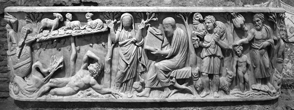 Илл. 18. Философ и его последователь, воздевающий руки в молитве. Как духовный наставник, «человек культуры» может даже спасать души. Фрагмент саркофага из базилики Санта Мария Антиква, Рим.