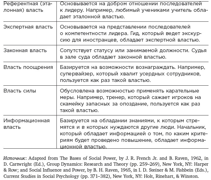 В современной вузовской программе труды Френча и Рэйвена (1959) – наиболее популярные работы по исследованию власти. В своей монографии они рассмотрели власть в условиях взаимозависимых отношений между тем, кто оказывает влияние, и теми, на кого это влияние направлено. Вместе Френч и Рэйвен выделили пять общих и важных форм власти: эталонная (референтная); экспертная; законная; власть, основанная на вознаграждении или же на принуждении. Рэйвен (1965) описал еще и шестую – информационную власть (таблица 1.1). Каждая из этих форм увеличивает способность лидера влиять на отношения, ценности или поведение последователей.