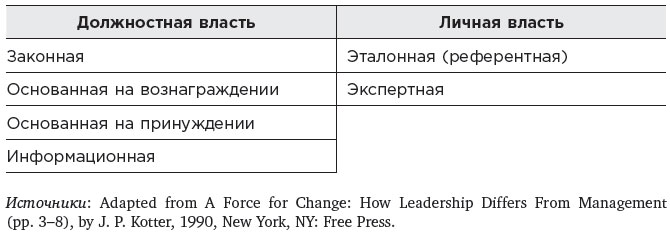 В организациях доминируют два типа власти: должностная и личная. Должностная власть включает несколько форм: законную, информационную, а также виды власти, основанные на вознаграждении или на принуждении (таблица 1.2). Это та власть, которую человек получает, занимая определенную должность или имея звание в рамках официальной системы. Способность влиять на группу появляется у лидера за счет более высокого статуса. Должностная власть выводит лидера на центральные позиции в структуре организации. Так, в силу занимаемой должности, вице-президент или руководитель отдела обладает большей властью, чем штатный сотрудник. Кроме того, неформальные связи повышают их социальную власть, тем самым еще сильнее отдаляя лидеров от последователей (Чиу, Балкунди и Вайнберг, 2017).