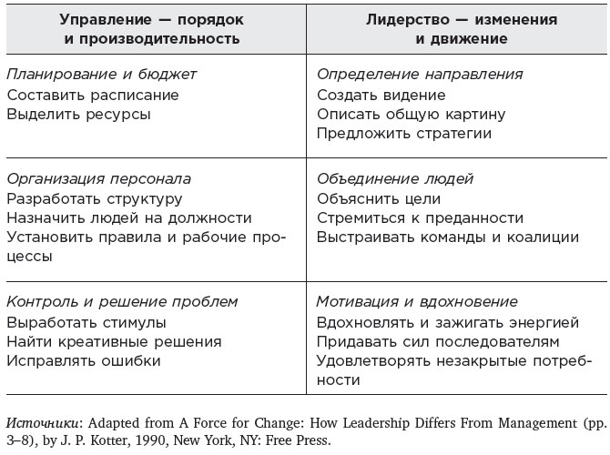 Коттер (1990) далеко не единственный ученый, настаивающий на подобном различии. Его точку зрения разделяют Беннис и Нанус (2007), подчеркивая разницу между этими явлениями: управлять – осуществлять действия и налаживать процессы, быть лидером – влиять на других и вести их к переменам. Ученые четко выразили это различие в своей часто цитируемой фразе: «Менеджер – это тот, кто все делает правильно, а лидер – это тот, кто принимает правильные решения» (стр. 221).