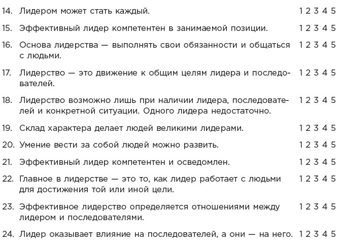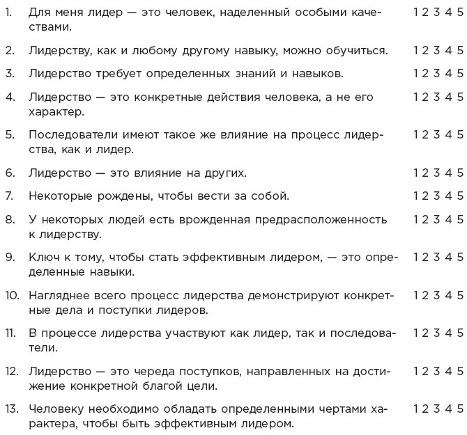 Инструмент лидерстваПонятие «лидерство» весьма неоднозначное и включает в себя множество аспектов. Для одних лидерство – это личностная черта или способность, для других – навык или поведение, для третьих – отношения или процесс взаимодействия. Скорее всего, лидерство включает в себя все эти компоненты, и каждый из них отвечает за определенный аспект. Какой подход наиболее близок вашему собственному представлению о лидерстве? Как вы определяете лидерство? Знать ответы на эти вопросы необходимо, ведь от того, как вы воспринимаете лидерство, будет зависеть то, как его практикуете. Предложенный ниже опросник поможет вам найти эти ответы.
