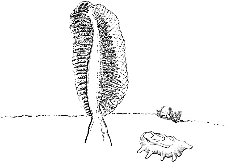 No clear cases of cnidarians or sponges, the animals I’ve been discussing as clues, are known from the Ediacaran, either. But in each case there are possibilities. Some Ediacaran organisms look a fair bit like present-day “sea pens.” These well-named organisms are in the same group as the soft corals we visited at the start of this chapter. But rather than trees, each looks like an old plumed pen with its nib stuck in the seafloor and feathers spreading on a stem above.