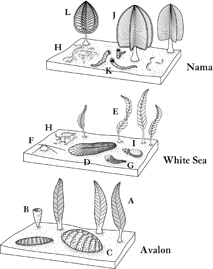 The creatures of the White Sea assemblage lived on shallow seafloors, not the depths as in Avalon. These are seafloors that were, in a sense, alive. They are sometimes referred to as “microbial mats,” but Mary Droser of the University of California, Riverside, who has become a central figure in work on this stage, calls them “textured organic surfaces.” These surfaces contained more than bacteria and the like, probably including algae-like organisms and small embedded animals. The fossil record preserves the textures themselves—“wavy-crinkly lamination, elephant-skin textures …” A tangle of living and dead organisms at different scales made up a mostly two-dimensional surface, a flatland in the sea.