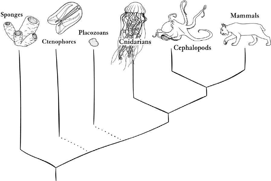 Nervous systems evolved somewhere below the split on the right that leads toward mammals and cephalopods on one side and cnidarians on the other. They may have evolved twice; this depends on unresolved questions about the tree, indicated by broken lines in the drawing.