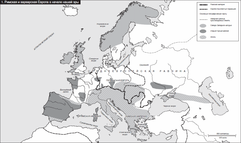 В начале 1-го тысячелетия имперская Европа, границы которой определялись лишь мощью и количеством легионов Рима, протянулась от Средиземноморского бассейна на север практически до самого Дуная и на восток до Рейна. Дальше жили европейские варвары, занимавшие отдельные горные области в Центральной Европе и большую часть Великой Европейской равнины, самый крупный из четырех основных географических регионов Европы (см. карту 1). Однако целостность этой обширной территории, имеющаяся в ее геологической структуре, не наблюдается в социально-экономической сфере. Тяжелая глиняная порода доминирует на ее бескрайних просторах, однако имеющиеся различия в климате и, соответственно, растительности породили существенную неравномерность и в плодородности земель, что очень важно для сельского хозяйства – оно зависит как от продолжительности посевного периода, так и от богатства самой почвы. Западные регионы, и в особенности Южная Британия, Северная Франция и страны Бенилюкса, подвержены влиянию атлантических погодных явлений, в них умеренные, влажные зимы и прохладные летние месяцы с обильными осадками. Почему именно британцы изобрели крикет, единственную игру, в которую нельзя играть под дождем, – одна из величайших загадок истории. В центральных и восточных регионах Европейской равнины климат больше похож на континентальный, зима там холоднее, а лето – жарче и суше. Средняя зимняя температура понижается дальше к востоку, и в юго-восточном направлении также уменьшается количество осадков, выпадающих летом. Исторически это явление оказывало значительное влияние на земледелие, особенно до эпохи Нового времени, когда технологии земледелия не отличались разнообразием. На юго-востоке, даже в знаменитых своим плодородием черноземных районах Украины, урожайность была ограничена малым количеством осадков летом и поселения появлялись преимущественно в речных долинах. На севере и востоке серьезные ограничения на земледелие накладывали суровые зимы. Из-за холодов лиственные, хвойные и смешанные леса, составляющие основные виды растительности в тех регионах, постепенно сдают позиции – сначала хвойным таежным лесам, затем арктической тундре. В широком смысле северная граница смешанной лесной зоны отмечает тот регион Европейской равнины, где почва еще достаточно богата гумусом, чтобы даже в далеком прошлом можно было получать приемлемый урожай и заниматься земледелием – либо традиционными методами, либо подстраиваясь под более суровые условия.
