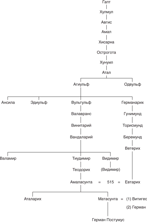 В равной степени важно то, что неоспариваемая власть братьев Амалов над паннонийскими готами была недавней. Один отрывок недопонятого рассказа из «Гетики» демонстрирует мнимое величие Амалов, запустивших руки в «историческую кассу». В этом отрывке описываются не некие успехи гунна – завоевателя готов (названного Валамвиром), а начало карьеры настоящего дяди Теодориха – Валамира. И эта картина мозаична. В ней Валамир – далеко не самый последний в длинной череде королей, осуществляющих власть над половиной всех готов; он локтями прокладывает себе дорогу, чтобы встать во главе группы других военных вождей. Валамир начинает с того, что лично убивает некоего Винитария и женится на внучке своей жертвы Вадамирке. В то же самое время последовательно истребляется другой соперничающий род, включающий отца (Гунимунда), двух братьев (Торисмунда и Генсемунда) и внука (сына Торисмунда по имени Беремунд). После различных смертей среди представителей старого поколения Генсемунд предпочел принять неизбежное и подчинился власти Валамира, тогда как Беремунд решил выйти из числа соперников и пошел своей собственной дорогой на запад. К концу 450-х гг. высокое положение Валамира и его братьев и даже их власть над паннонийскими готами были результатом тяжелой борьбы с многочисленными соперниками, которая закончилась, вероятно, после смерти Аттилы в 453 г., так как тот не терпел слишком могущественных правителей среди подвластных ему народов[10].