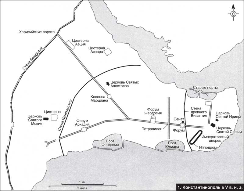 Сильный контраст между обломками старых римских провинциальных процветающих городов и неумеренным великолепием столицы Восточной Римской империи – Константинополя середины V в. поразил Теодориха. Первое, что потрясло его, были размеры самого города. Хронологически стены Феодосия были уже третьими. Стены древнегреческого Византия окружали приблизительно прямоугольное пространство на оконечности полуострова площадью около 2×1,5 км (карта 1). Стены, построенные Константином в 320-х гг., более чем утроили защищенное пространство, а императором Феодосием – снова увеличили его более чем вдвое. Но не все здесь было застроено: еще оставались большие огороды и парки, особенно между стенами Феодосия и Константина, но обычный римский город, населенный, наверное, 10 тысячами жителей, к 463 г., вероятно, стал крупнейшим в Средиземноморье, с населением предположительно более 500 тысяч человек.