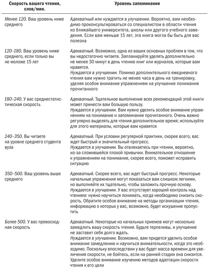 Предположим, вы готовы начать. Вы рассчитали начальную скорость чтения, знаете, как вычислить количество слов в минуту, и получили хорошее представление о собственном уровне запоминания прочитанного. Ну что ж, теперь самое время над всем этим поработать.