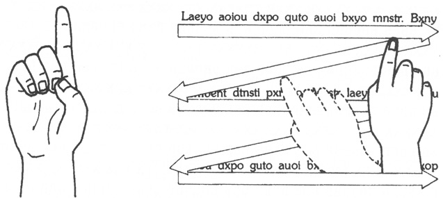 1. Тренируйтесь в течение нескольких минут делать движение рукой («подчеркивание» указательным пальцем) на условном, не имеющем смысла тексте, приведенном в конце этого упражнения.
