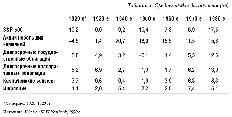 Наиболее убедительное доказательство, которое я обнаружил со времени последнего обсуждения этой темы, содержится в ежегоднике Ibbotson SBBI Yearbook за 1990 г. в главе 1 на с. 16 под заголовком «Среднегодовая доходность по десятилетиям с 1926 по 1989 г.». Это сводка величин годового дохода инвесторов от вложения денег в акции индекса S&P 500, акции небольших компаний, долгосрочные государственные облигации, долгосрочные корпоративные облигации и краткосрочные казначейские векселя. Результаты приведены в табл. 1.