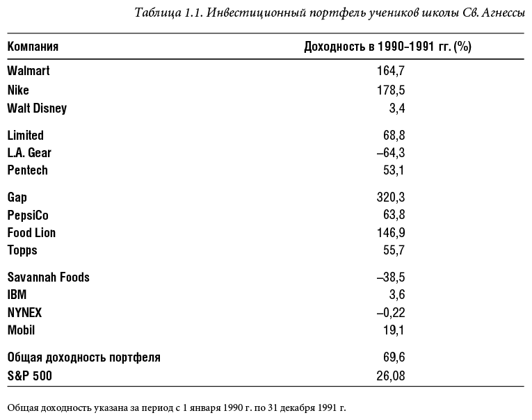 Четырнадцать акций, приведенных в табл. 1.1, были выбраны группой энергичных портфельных менеджеров, учившихся в 1990 г. в седьмом классе школы Св. Агнессы в Арлингтоне, штат Массачусетс, недалеко от Бостона. Генеральный директор школы и преподаватель Джоан Моррисей решила проверить предположение о том, что для успеха на фондовом рынке не обязательно иметь доступ к системе Quotron, степень MBA от Школы бизнеса Уортон и, если уж на то пошло, даже водительские права.