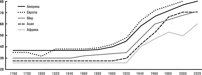 Не может не радовать рисунок 2.3! Продолжительность жизни в мире постоянно растет. Вы только подумайте: человек, родившийся в нынешнем году, может рассчитывать на то, что проживет в среднем на три месяца больше, чем тот, кто родился в 2019 году. На ранних этапах моей карьеры у пожилых клиентов были серьезные проблемы со здоровьем, и, планируя финансирование своих последних лет жизни, они часто задавали вопросы о ценах на содержание в хосписах. Сегодня они настроены прожить как можно дольше и больше интересуются экспериментальными методами лечения и последними открытиями в области медицины. Эти клиенты понимают, что чем дольше проживут, тем выше вероятность, что очередное открытие поможет им решить проблемы со здоровьем.