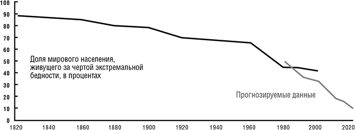 Рисунок 2.4, пожалуй, самый красноречивый. Если вы не можете похвастать королевским происхождением, то, скорее всего, вам не придется слишком углубляться в свою родословную, чтобы найти предков, которым денег едва хватало на жизнь. До 1950-х годов подавляющее большинство людей на нашей планете жило в условиях экстремальной бедности. Этим термином обозначается жизнь на сумму менее 2 долларов в день (с поправкой на инфляцию). В 1980-е годы в эту категорию все еще входило 44 процента мирового населения. Сегодня же, спустя всего четыре десятилетия, в таких условиях живет уже менее 10 процентов населения. Что изменилось? Техническое развитие и экономический рост обеспечили переход сотен миллионов людей в средний класс. Хотите еще больше хороших новостей? По оценкам Всемирного банка, мы сможем полностью ликвидировать нищету в течение ближайших 20 лет!