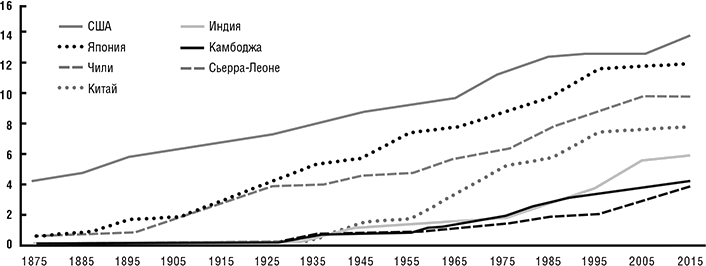 На рисунке 2.1 заметен резкий спад той доли доходов, которую мы в нашей стране тратим на нужды выживания. Другими словами, у нас стало оставаться значительно больше свободных денег. Мы можем тратить их на учебу в колледже, на поездки в Диснейленд, покупку дорогих машин, которые ездят без водителя, на вечерние посиделки, кинотеатры с громадными откидными кожаными креслами и, разумеется, на пенсионные накопления. С точки зрения истории все это относительно новые феномены.