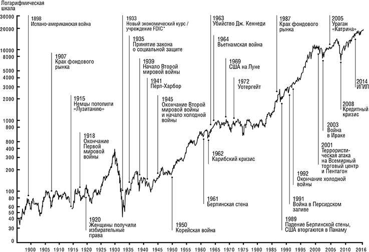 На каналах, где рассказывают о погоде, зрителей больше всего привлекают описания ураганов и смерчей. Однако бо́льшую часть времени репортажи довольно скучны: переменная облачность, вероятность дождя 30 процентов, возможны грозы. В таких известиях нет ничего захватывающего для зрителей. Аналогичным образом обстоит дело и в мире финансовых новостей. Рынки то растут, то падают, компании выходят на биржу с первичным размещением акций – во всем этом нет ничего революционного. Чтобы придать новостям интерес, журналисты зачастую выдают самые заурядные истории об обычном падении котировок в течение дня за финансовый кризис, но это, как правило, практически никак не сказывается на долгосрочных тенденциях рынка. Вот почему мне так нравится график, представленный на рисунке 2.6. Как видите, на нем с трудом удается отыскать свободное место, куда можно впихнуть известия о различных «кризисах», происходивших начиная с 1896 года. А что же рынок? Ему до этого нет дела. Он продолжает покорять все новые высоты, щедро вознаграждая инвесторов, вкладывающих деньги на долгосрочной основе.