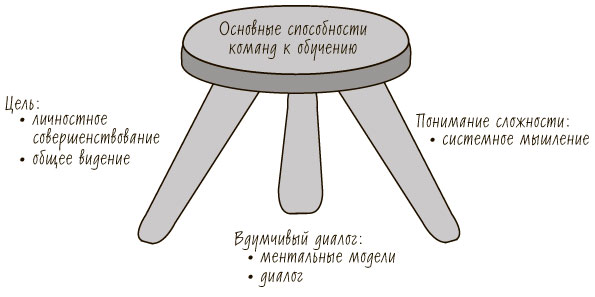 Элементы, которые Деминг включил в понятие «фундаментальных знаний», легли в основу простейшего и наиболее распространенного сегодня способа представления пяти обучающих дисциплин. Когда первое издание книги готовилось к печати, этот способ еще не был очевидным. Пять дисциплин предлагают подходы (теории и методы) для развития трех ключевых способностей к обучению: стремление к цели, вдумчивый диалог и понимание сложности. Опираясь на изложенную в первом издании книги мысль о том, что базисными обучающимися единицами в компании являются рабочие группы (люди, зависящие друг от друга для достижения результата), мы стали называть эти дисциплины «основными способностями команд к обучению» и символически представили их в виде трехногой табуретки, чтобы визуально отразить важность каждой из них: при отсутствии любой из ножек табурет теряет устойчивость.